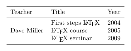 \documentclass{article} \usepackage{multirow} \usepackage{booktabs} \begin{document} %... \begin{tabular}{lll} \toprule Teacher & Title & Year \\ \midrule \multirow{3}{*}{Dave Miller} & First steps \LaTeX{} & 2004 \\ & \LaTeX{} course & 2005 \\ & \LaTeX{} seminar & 2009 \\ \bottomrule \end{tabular} %... \end{document}